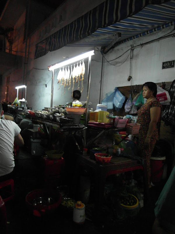Jak to w Azji jedzenie przygotowuje się na ulicy bo jest wesoło i można pogadać. Warunki higieniczne jak to w Azji, typowe. Na pierwszy rzut oka wydaje się że syf, jednak po dokładnym przyjrzeniu się wszystko ma swój sens zapewniający pewne bezpieczeństwo jedzenia. Mięsa raczej się nie przechowuje. Zwierzęta zabijane są rano i sprzedawane od razu na targu. Kury sprzedawane są żywe. Oczywiście w różnych regionach są różne zwyczaje i różne rzeczy się jada. Np. w okolicy Phan Rang podobno jedzą gekony. Podobno jedzone bywają też psy. Biorąc pod uwagę fakt, że najczęściej wybieramy jedzenie pokazując palcami, albo zdając się na opinie kucharza, ciężko powiedzieć czy zjedliśmy psa. Jedliśmy różne dziwne mięso, ale chyba nie psa…
