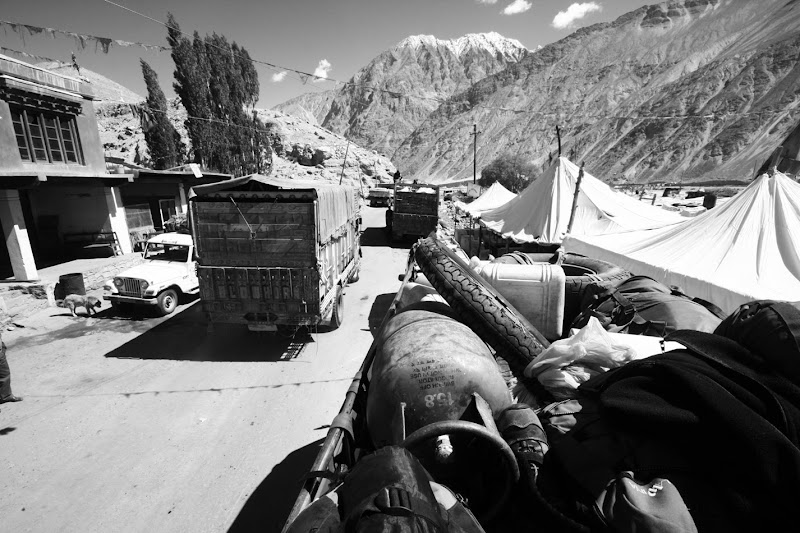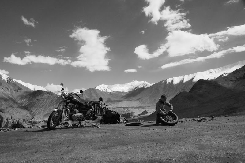 Przy okazji Anuśka stwierdziła że odpuszczenie trekkingu i zostanie na motorze to był genialny pomysł. Spacery na tej wysokości są jakby nie patrzeć bardziej męczące. W przeddzień wyjazdu dojechało do nas kilku indyjskich motocyklistów którzy okazali się niezwykle nieprzydatni w próbie naprawy naszego motocykla. Odkręciłem gaźnik i starałem się coś jeszcze z niego wycisnąć, gdy nowi koledzy stanowczo twierdzili, że mam zapchany filtr powietrza i na nic się nie zdało tłumaczenie, że już dawno filtra nie mam. Do tego Pech nr 10. Przy próbie odjazdu okazało się że złapaliśmy gumę. Tym razem zabrałem łyżkę do opon i obyło się bez zbędnych komplikacji. Zrobiło się jednak trochę późno na podróż i zostaliśmy w okolicy dzień dłużej. Najpierw zatrzymał nas jakiś wojskowy (Pech nr 11), bo zrobiłem sobie skrót przez stary poligon. Skończyło się klasycznie, herbatka, zestaw pytań o zimę w Polsce, pół godziny w plecy. Później rozpaliliśmy ognisko i z braku kurczaka upiekliśmy warzywa. Niestety pośród pomidorow i bakłażanów zaplątały się papryczki chilli. Nie wiedziałem że przy skrajnie ostrym smaku w ustach i niemożliwości ugaszenia palenia, łapie dziwny rodzaj czkawki. Teraz już wiem, więc można potraktować to jako nowe doświadczenie, jednak nie jestem aż takim optymistą i wolę napisać raczej Pech nr 12.