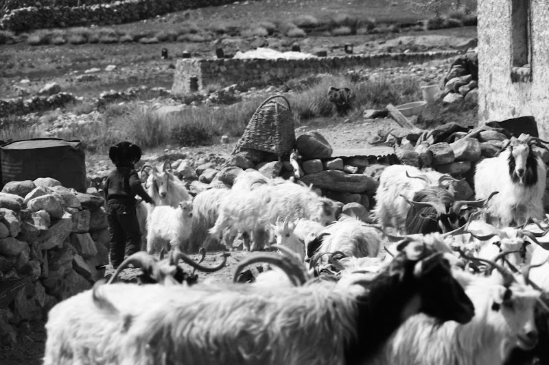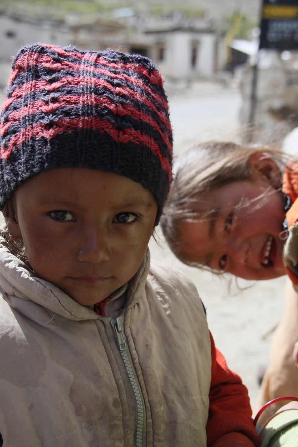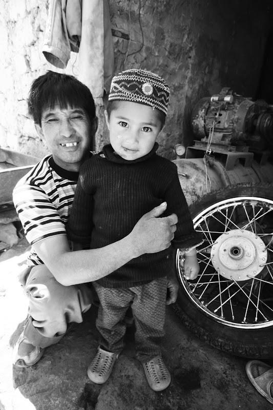 Rano pojechaliśmy razem z odkręconym kołem do największej wioski doliny Nubry – Distic, którą zapamiętam ze względu na dostępność takich zdobyczy cywilizacji jak warsztat. Dętka została fachowo wymieniona, jednak w całej wiosce nie byliśmy w stanie kupić opony 19″ a nasza była kompletnie pocięta po jeździe na flaku. Miejscowy machanik obejrzał ją wprawnym okiem i stwierdził że jest jeszcze całkiem ok i możemy jechać 🙂 Za dużego wyboru nie mieliśmy. Naprawa skończyła się sesją fotograficzną z okolicznymi dzieciakami, jak zwykle usmiechniętymi i uwielbiającymi pozować.