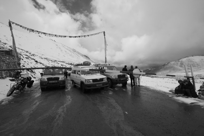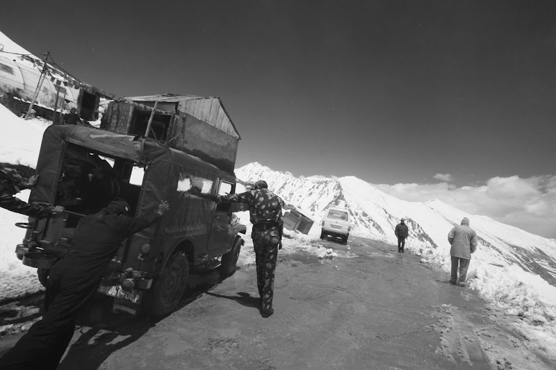 Wręczyłem mojej swieżo upieczonej towarzyszce podróży kask i poinformowałem, że załatwione permity mają ograniczony czas ważności, więc musimy wyjechać dziś. Poza tym decyzja ta była dobra ze względu na aklimatyzację. Skoro Anuśka dość dobrze czuła się na 3500 m, warto byłoby wjechać wyżej i zjechać trochę niżej na noc. Stare poczciwe zasady. Droga jak każda inna w okolicy. Szerokość ok. 3 m, serpentyny po zboczach, bezpieczeństwo gwarantuje trąbienie przed zakrętem, w niższych partiach asfalt, wyżej podziurawione klepisko. Mają tutaj taki zwyczaj przepuszczania wody nad drogą, co jest dość denerwujące zwłaszcza jak się jedzie motocyklem. Czasami trzeba przejeżdżać przez rwące strumyki o głębokości do 0,5 m. Dojechaliśmy do posterunku wojskowego ok. 300 m poniżej przełęczy. Poinformowano nas, że przełęcz jest “chwilowo” nieprzejezdna i trzeba czekać. Po ok. 3 godzinach i 5 herbatach czekania, postanowiliśmy zawrócić i spróbować następnego dnia. Jak sie później okazało, był to pierwszy objaw Pecha, który został naszym nowym towarzyszem przez najbliższe dni. Anuśka oraz motocykl wykazali nieznaczne objawy choroby wysokościowej, objawiające się głównie brakiem siły podczas przemieszczania.