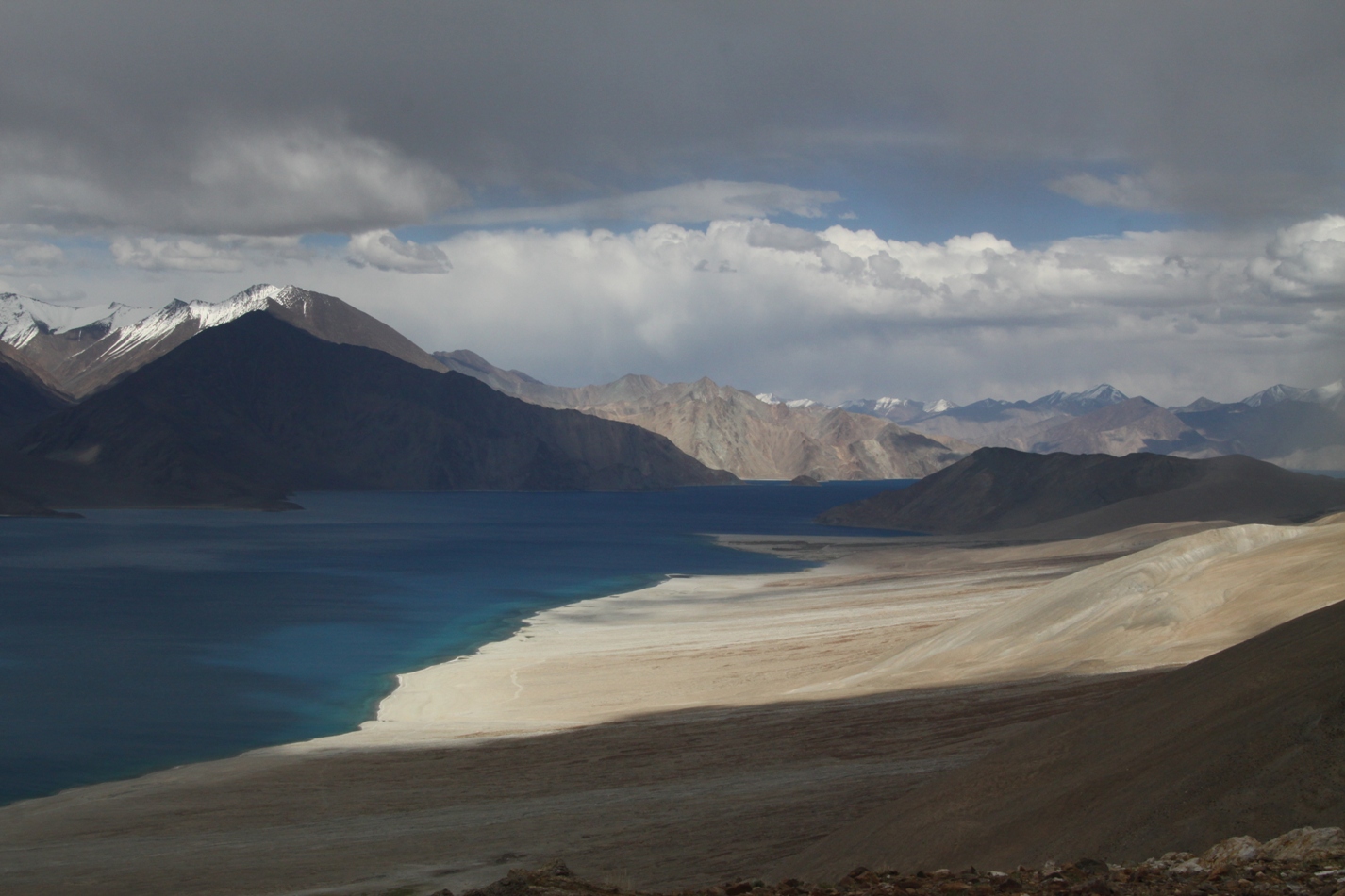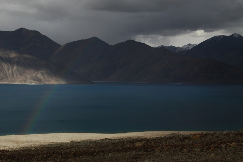 Jezioro Pangong robi naprawdę duże wrażenie, zwłaszcza przez położenie pomiędzy górami i błękitny kolor wody. Wspięliśmy się na okoliczne wzgórze i odsłonił się nam widok na kilkadziesiąt km jeziora dalej w stronę granicy.