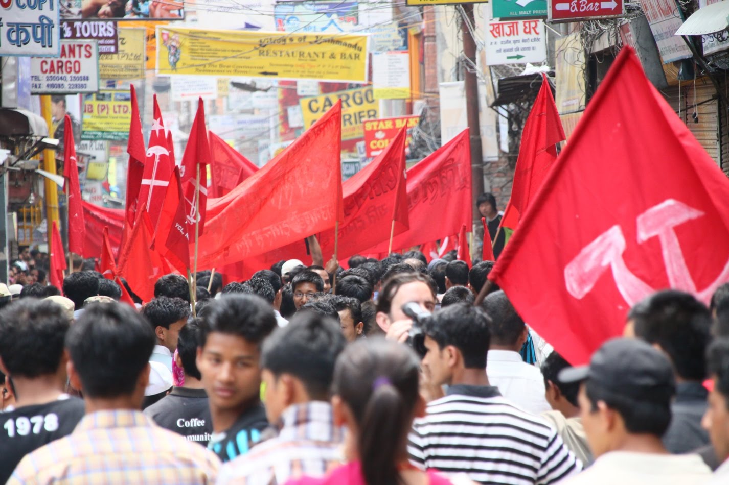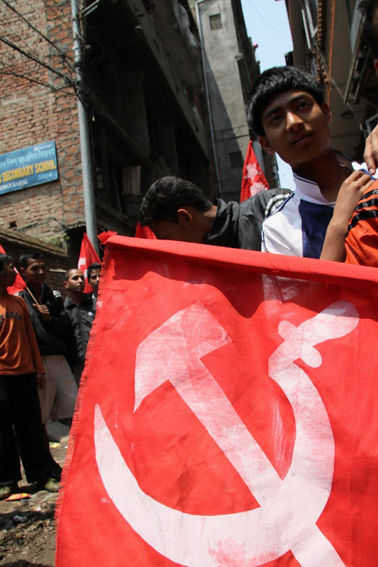 Wyszedłem, przed hotelem stało z 15 osób, mieli kilka flag. Niezbyt huczny ten pochód, pomyślałem. Po godzinie prze ulice Kathmandu przelewał się prawdziwy potok ludzi z czerwonymi flagami z sierpem i młotem. Normalnie jak w podstawówce 🙂 Krzyki, nawoływania, oklaski, przemowy!
